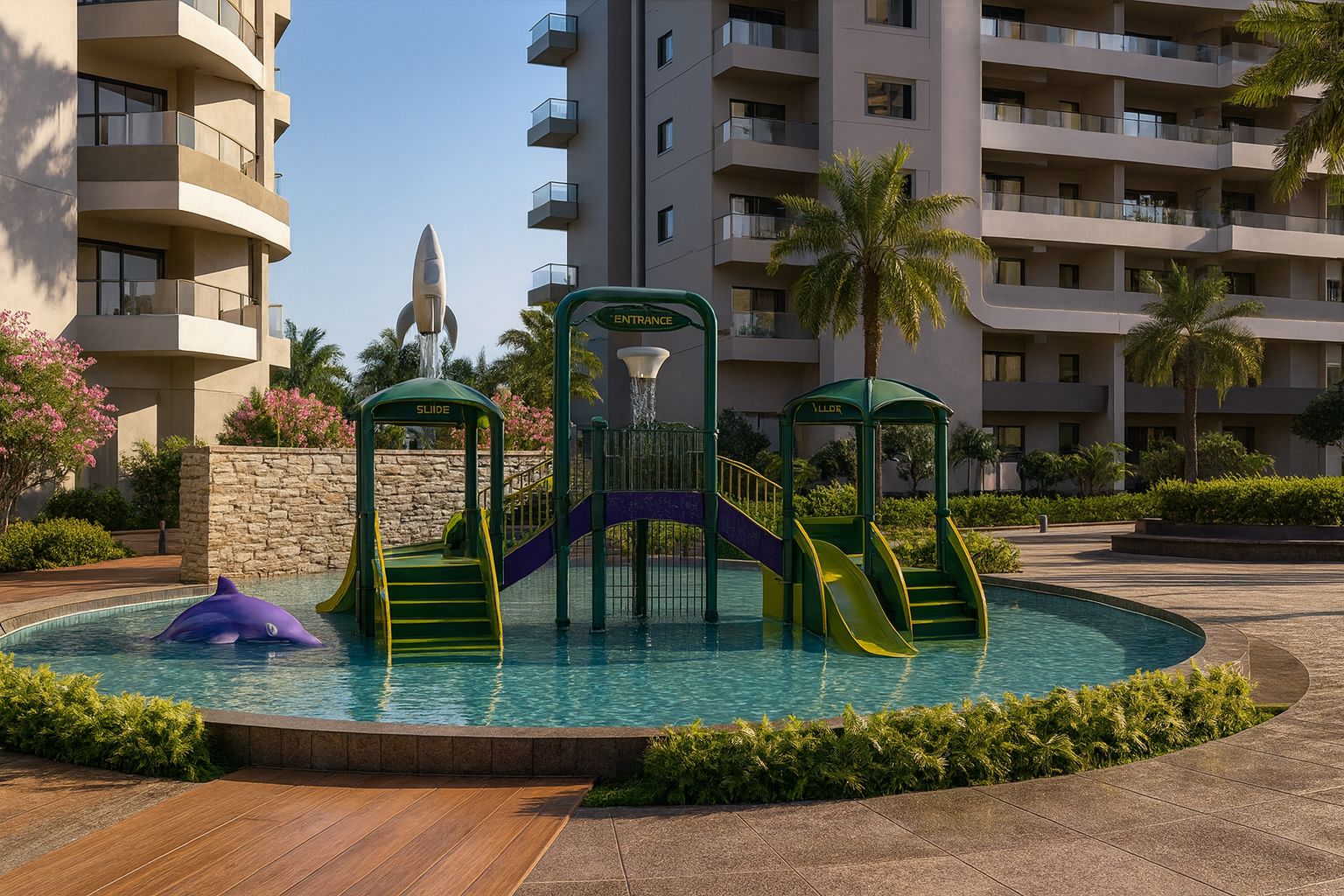 • Kids’ water play areas and themed play zones